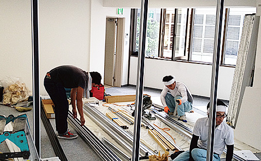 アルミパーティション工事、スチールパーティション工事、OAフロア工事、軽量鉄骨下地組み、ボード工事、塗装工事、ガラス工事、壁クロス貼り、造作工事、サイン工事、照明設備工事、電源工事、空調工事、ガス配管工事